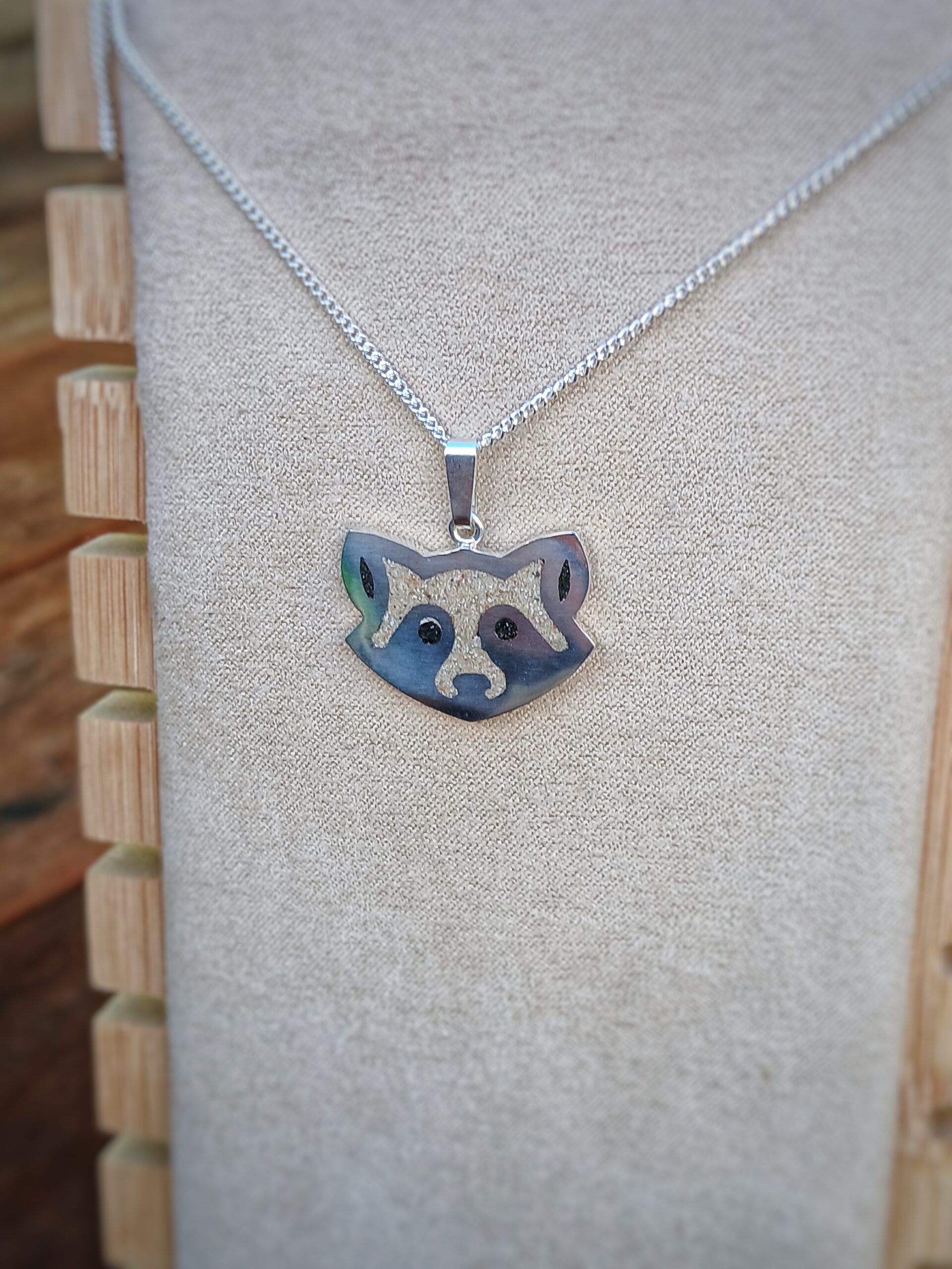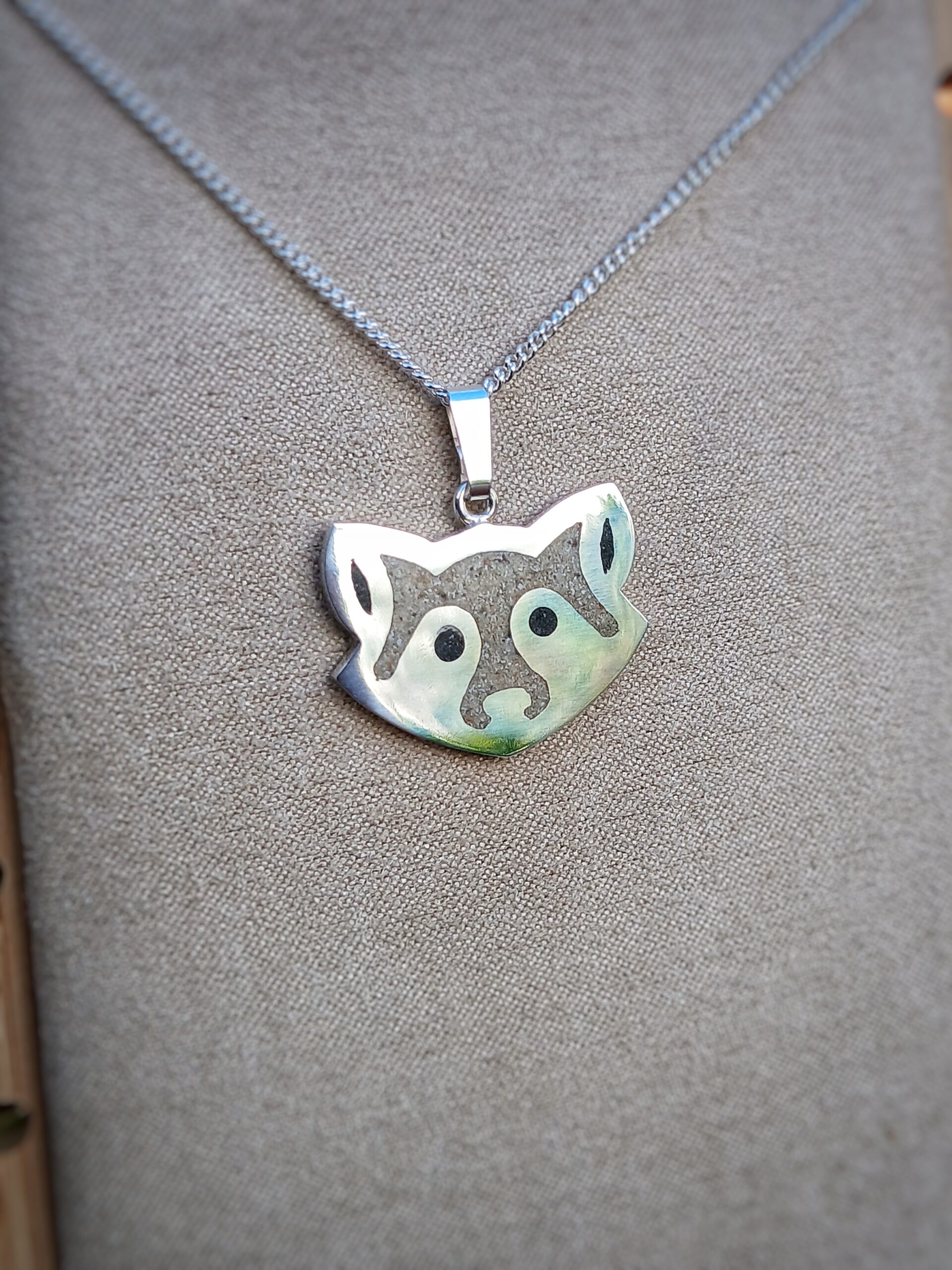 Ce pendentif représente une tête de racoon, symbole de curiosité, d’intelligence et de liberté.